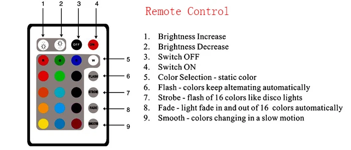 1.Brightness increase 2.Brightness decrease 3.Switch off 4.switch on 5.color selection-static color