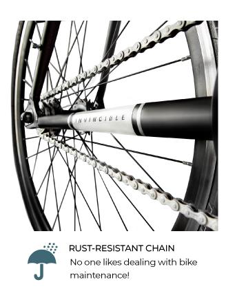 Built for the city, perfect for anywhere. The Invincible features custom security bolts that keep your bike and parts protected from thieves. A rust-proof frame and rust-resistant chain, paired with puncture-resistant tires, make this a no-hassle bike. The Invincible comes 80% assembled, and you do the rest with the help of our awesome online assembly instructions. Your custom security tools are included, see HERE for additional tools needed for assembly. Please double check the sizing guide!